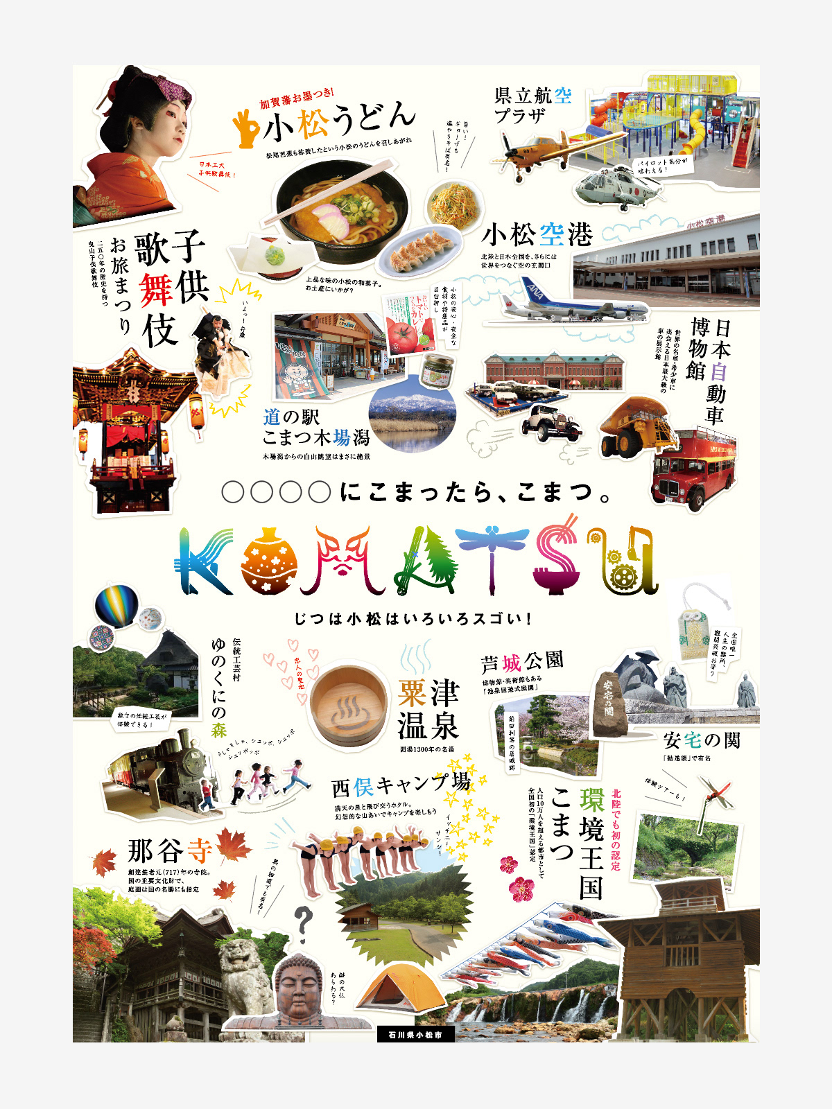 ロゴは小松市の名物や産業、特産物をモチーフに、絵文字風にデザイン。